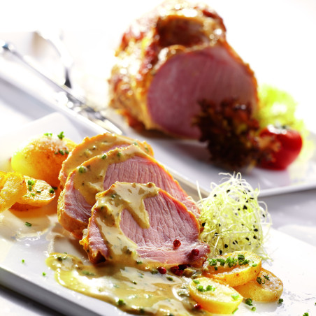 Plat typiquement alsacien, une belle pièce d'épaule de porc, enroulée dans une crépine de porc et de la moutarde.